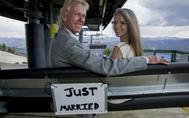 On June 18, 2013, we were married at the top of the Independence SuperChair, with our families present. Breckenridge resort personnel played a huge role in the day going smoothly, from getting everyone to Peak 7 via 4×4, to the “Just Married” sign on our chair as we rode down the Colorado SuperChair. As added sentiment, we both wear the Breckenridge rings for our wedding bands. Breckenridge has always been a special place for us, we cherish our Grand Breck memory, and look forward to making more wonderful memories in Breckenridge.”